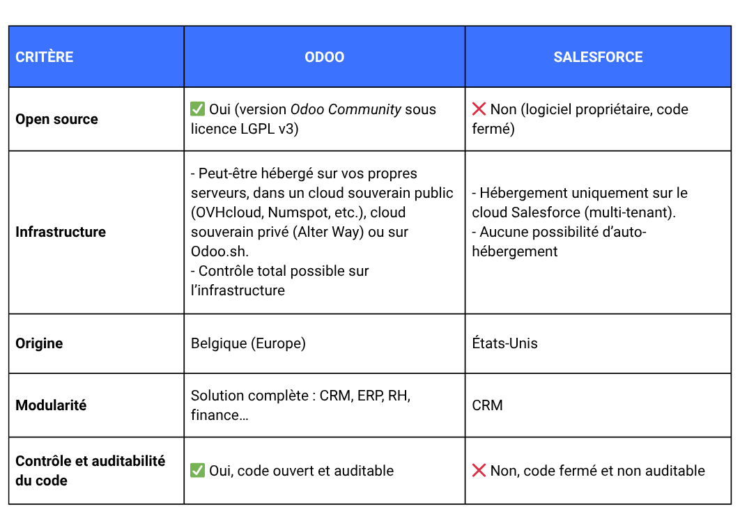 Odoo constitue une alternative sérieuse face à Cegid, Microsoft Dynamics 365, Netsuite, SAP Business One, Sage, Salesforce ou Oracle. Les entreprises qui choisissent Odoo peuvent éviter la dépendance à un éditeur unique, tout en conservant des fonctionnalités comparables à celles des solutions propriétaires.