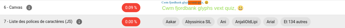 Puis vient l’étude des résultats des attributs JavaScript et l’unicité devient encore plus évidente. Le Canvas, qui représente le rendu d’une image selon une suite d’instructions précises, n’est commun qu’avec 0,09 % des résultats (voir figure 2). Enfin, la liste des polices de caractères n’est commune avec aucun autre résultat.