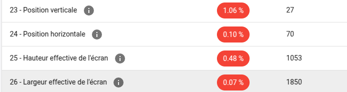 Et ce ne sont pas les seuls résultats qui sont quasi uniques. Concernant cette machine, on retrouve des informations telles que la hauteur et la largeur de l’écran (avec respectivement 0,48 % et 0,07 % de résultats communs) ou la position verticale et horizontale du premier pixel non utilisé. (voir figure 3)